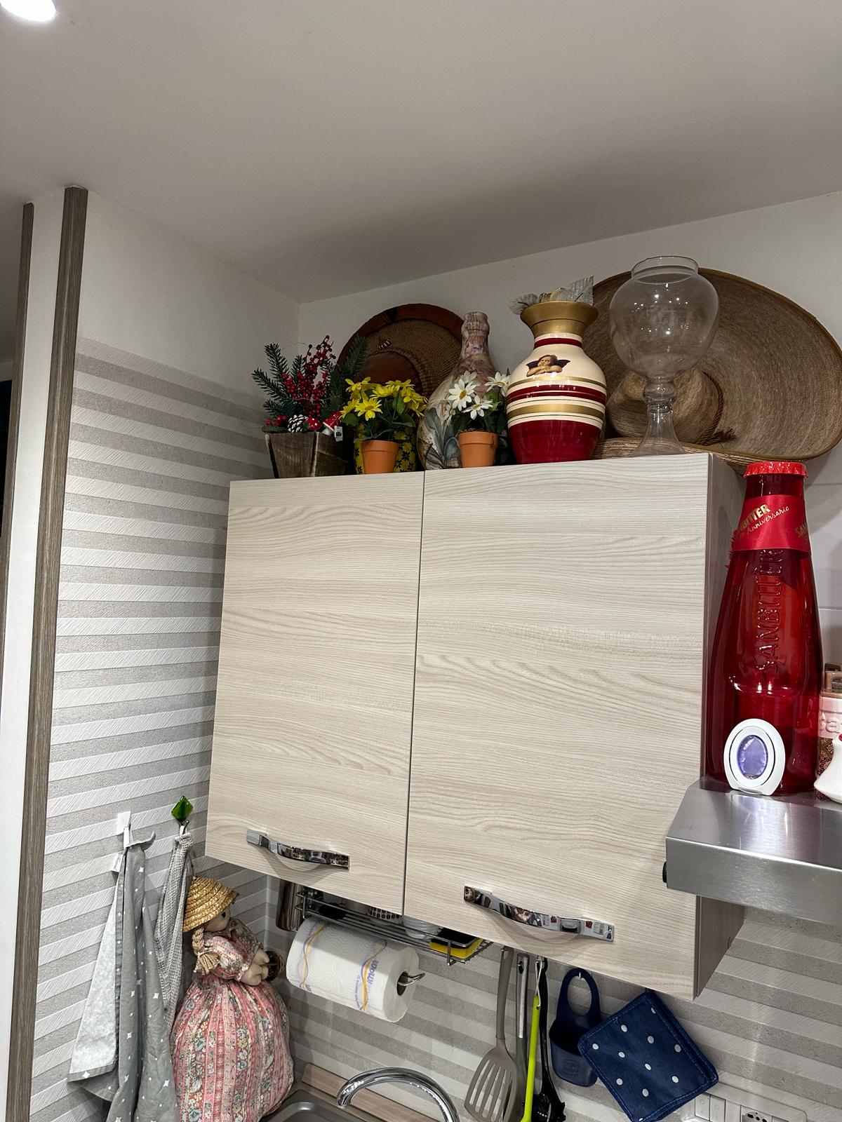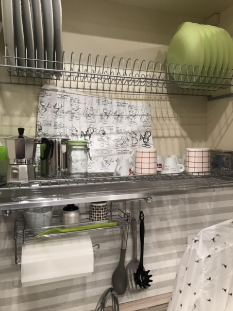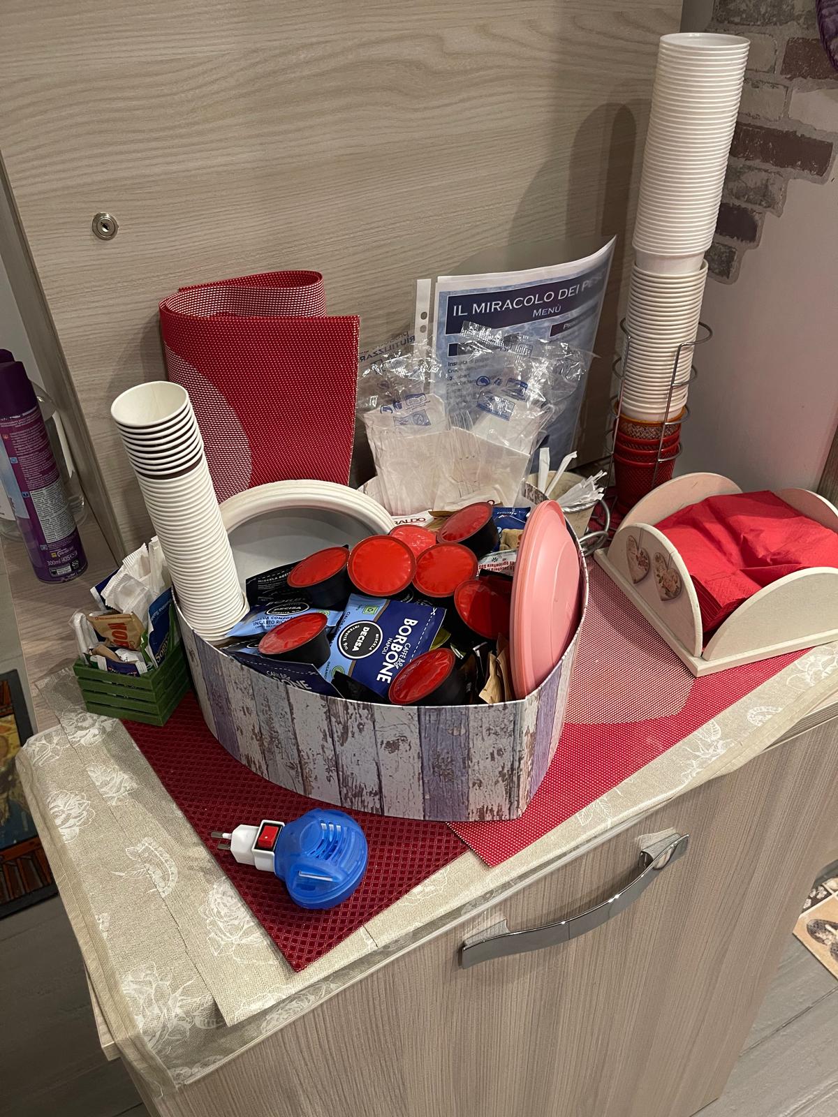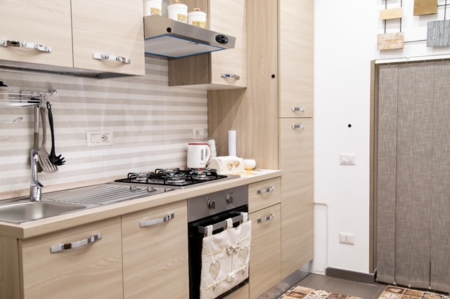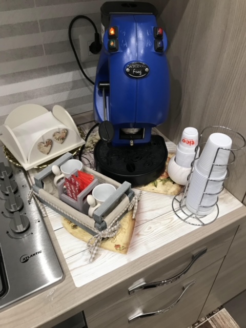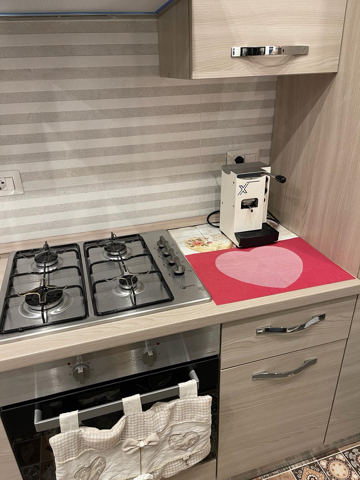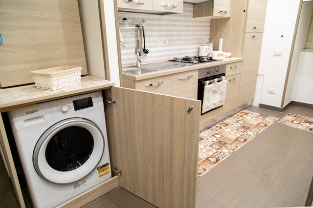 CUCINA: Cucina completamente attrezzata (piatti, pentole, forno, fornetto, frigo, macchina caffè, bollitore, tostapane, mini aspira briciole, stendi panni da interno, ecc...)