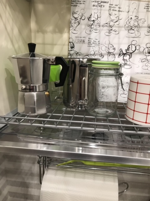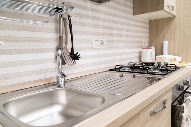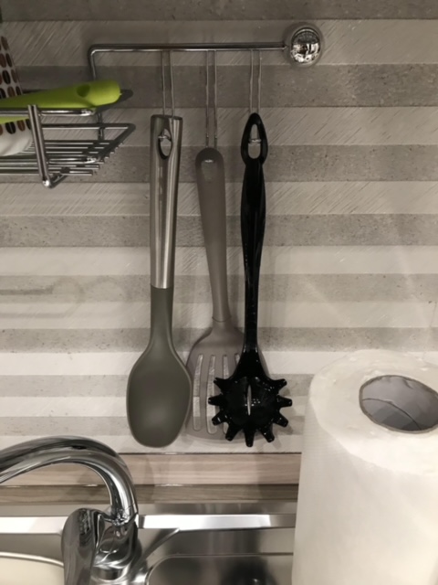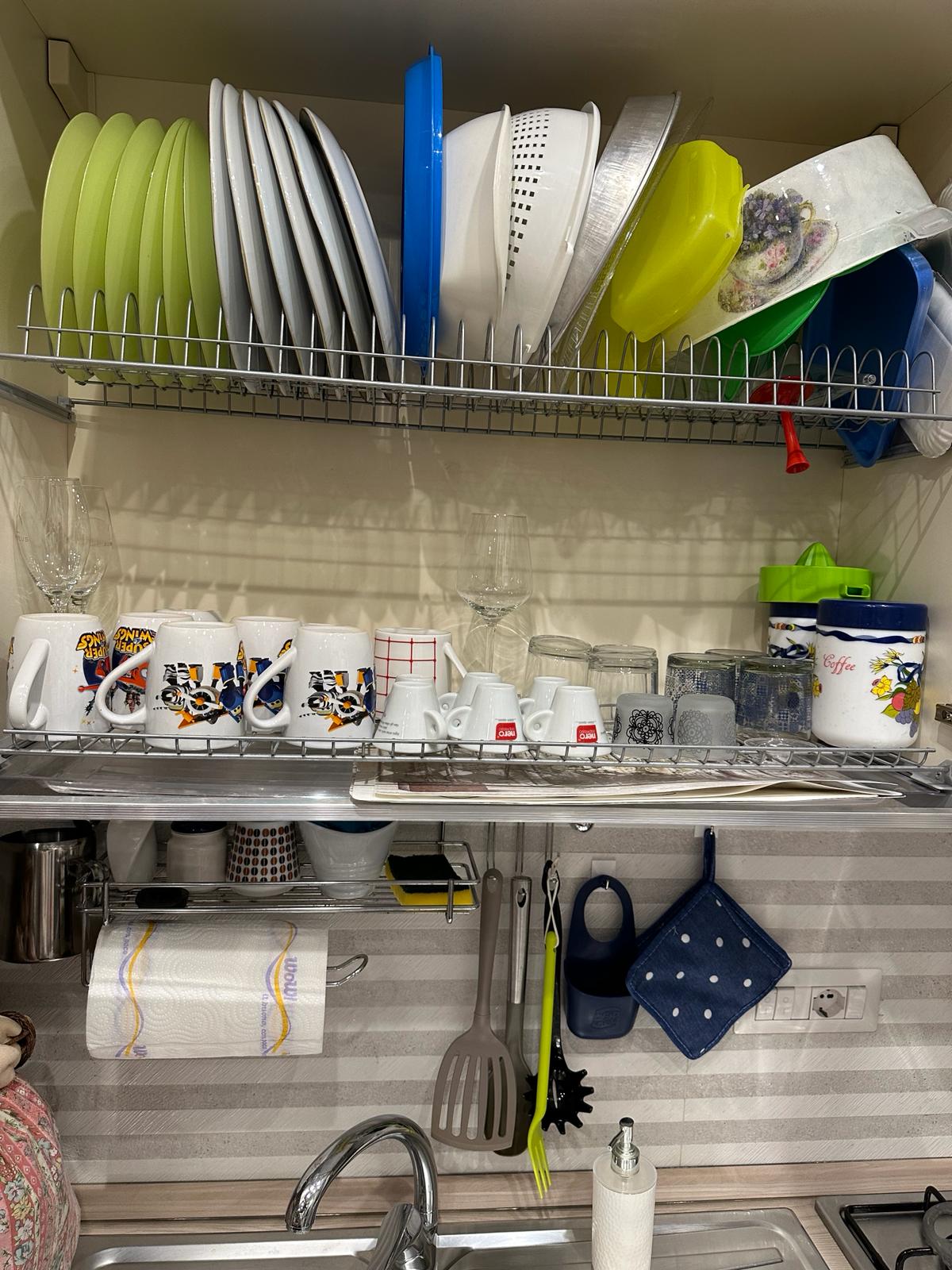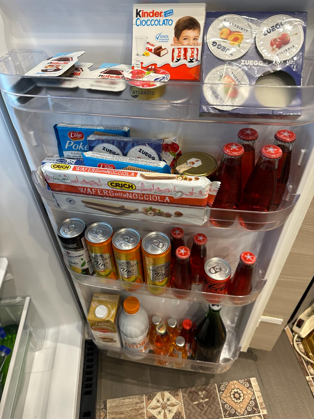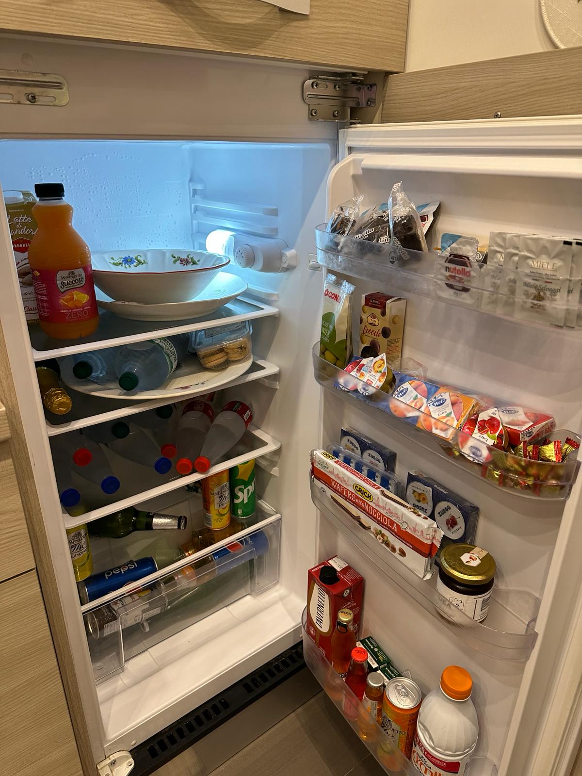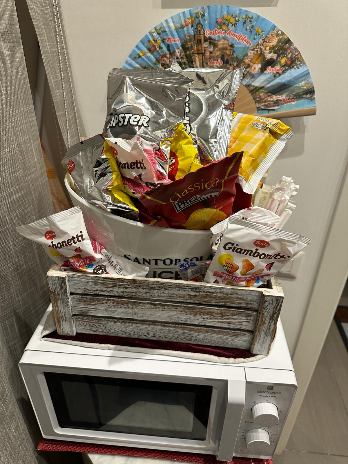 CUCINA: Cucina completamente attrezzata (piatti, pentole, forno, fornetto, frigo, macchina caffè, bollitore, tostapane, mini aspira briciole, stendi panni da interno, ecc...)